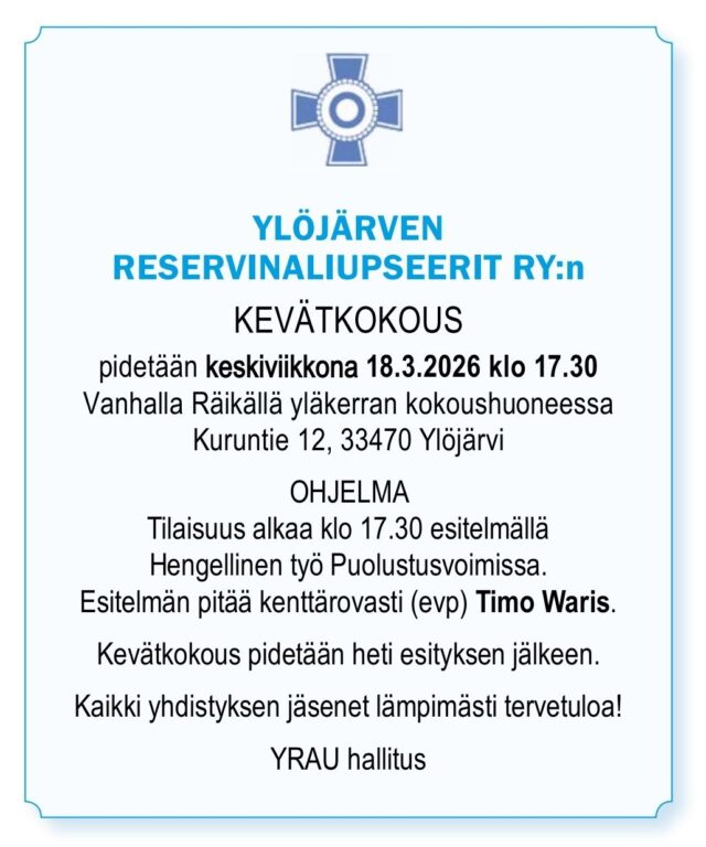 YLÖJÄRVEN RESERVINALIUPSEERIT RY:n KEVÄTKOKOUS Pidetään keskiviikkona 18.3.2026 klo17.30 Vanhalla Räikällä yläkerran kokoushuoneessa Kuruntie 12, 33470 Ylöjärvi